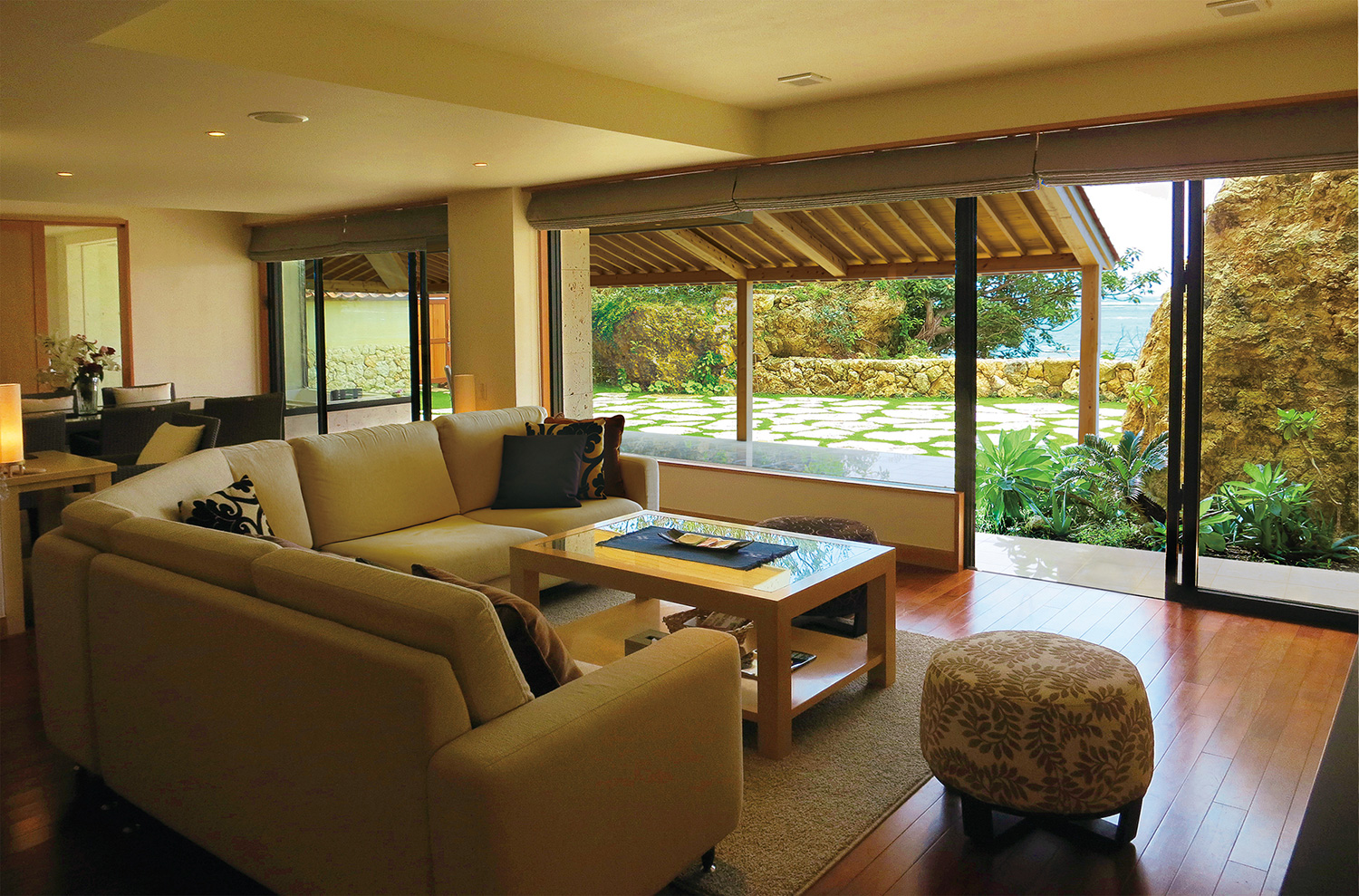 特別室「湛水の間」は、まるで庭園と一体になったような開放的なお部屋。広々とした洋間だけでなく、個室にもなる落ち着いた畳間がございます。庭園には巨岩 と緑の合間から青い海がきらきらと輝き、波音が心地よくお部屋に響き渡ります。