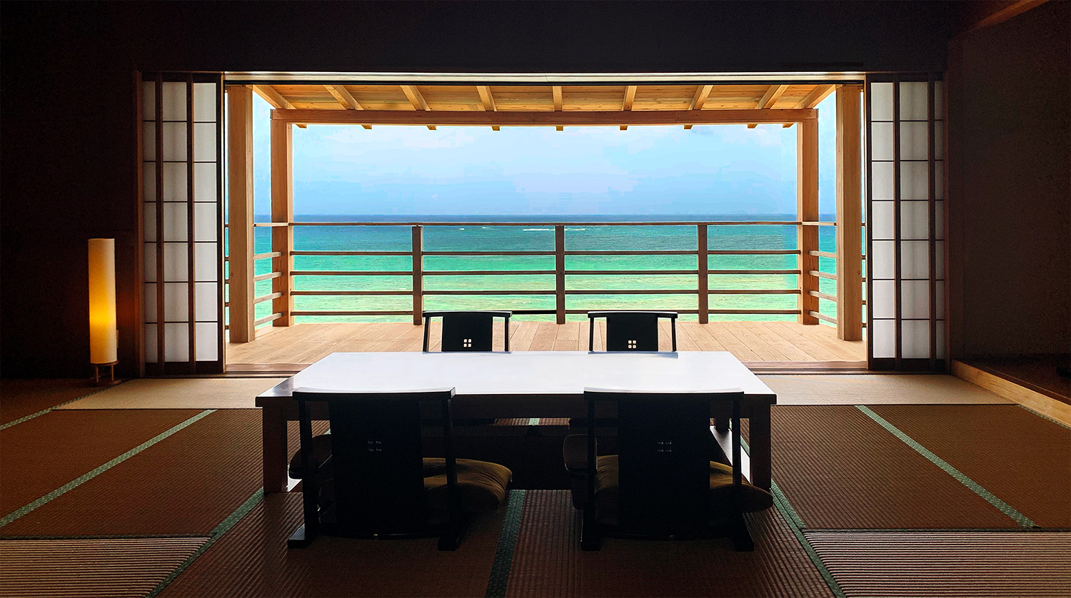 座して、海と山にくつろげる、静謐な和室となっております。